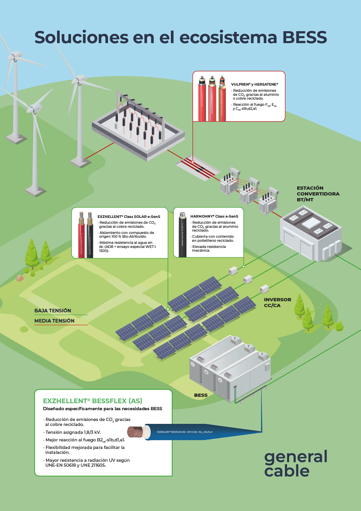 Los sistemas BESS (Battery Energy Storage Systems) están ganando protagonismo por su capacidad para equilibrar la red y facilitar la integración de renovables. En este escenario, General Cable presenta EXZHELLENT® BESSflex (AS), un nuevo cable de baja tensión diseñado para la interconexión entre módulos de baterías y las estaciones convertidoras que transforman la corriente continua en alterna para su consumo o inyección a red.