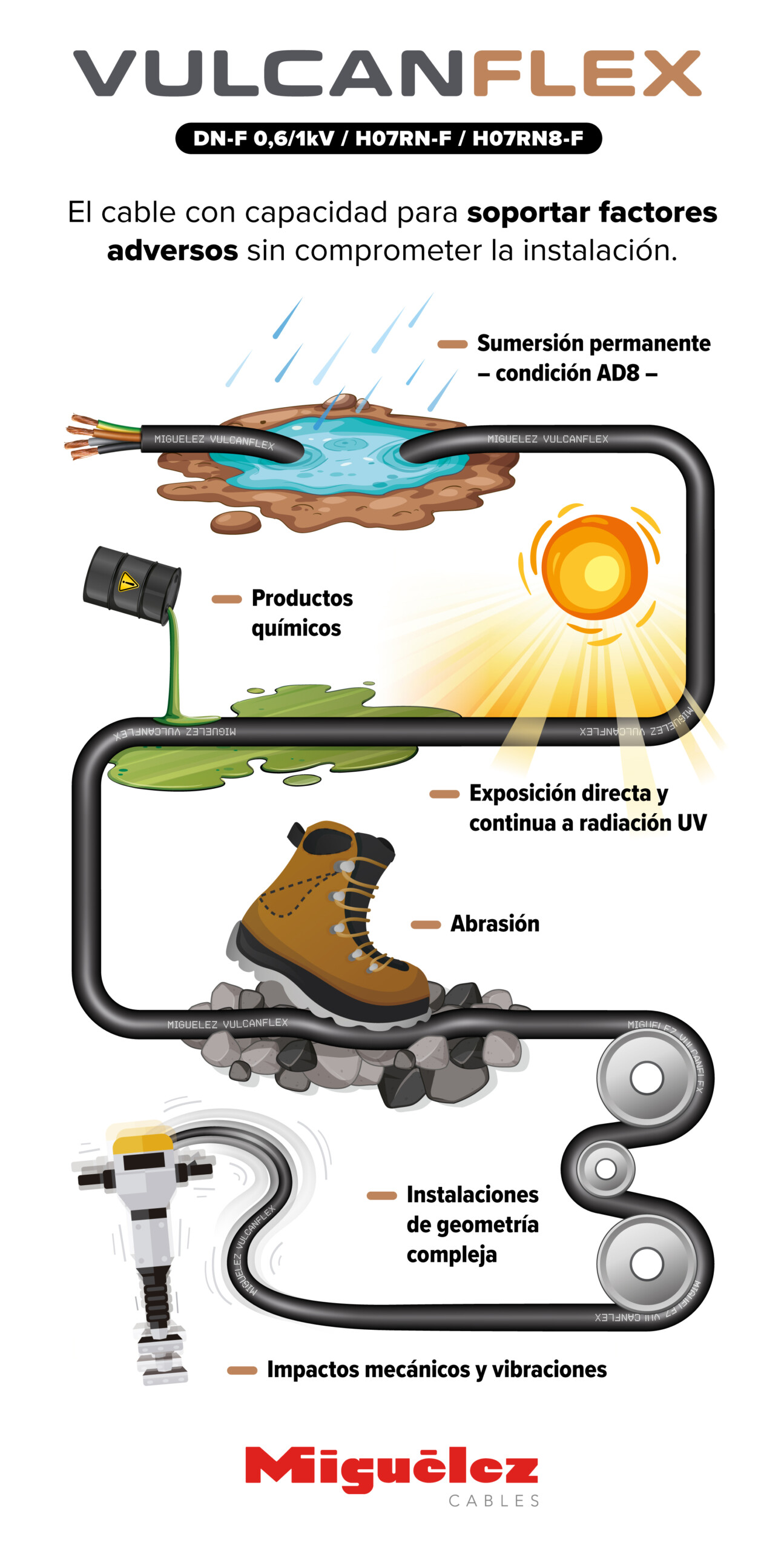 Cuando una instalación se enfrenta a ambientes agresivos, uso intensivo o servicio en exterior, el cableado tiene que aguantar mucho más que la tensión nominal: flexiones continuas, humedad, golpes, abrasión o radiación solar. Para responder a ese tipo de exigencias, Miguélez presenta su nueva gama VULCANFLEX DN-F 0,6/1 kV, dentro de las designaciones H07RN-F / H07RN8-F, diseñada para ofrecer fiabilidad en escenarios especialmente “duros”.