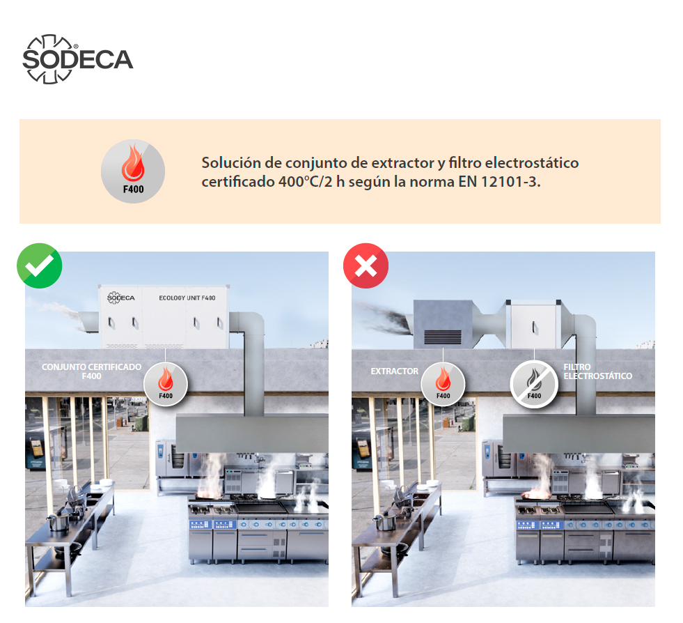 Las soluciones ECOLOGY UNIT cuentan con certificación F400 (400 °C / 2 h) conforme a la norma EN 12101-3, lo que acredita su capacidad para seguir operando en condiciones extremas, como escenarios de evacuación de humos en caso de incendio. Además, la certificación se realiza sobre el conjunto (ventilación + filtración), reforzando la fiabilidad del sistema en cocinas industriales.
